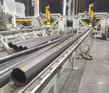 我公司自行開發(fā)的數(shù)控開卷斜剪生產(chǎn)線,直接從鋼卷到等腰梯形板輸出,自動化程度高,速度快。在非常成熟的數(shù)控雙機(jī)聯(lián)動折彎機(jī)的基礎(chǔ)上,我們做了很多改進(jìn),使得機(jī)器專門適合于快速高效生產(chǎn)路燈桿。應(yīng)客戶的要求,我公司自行開發(fā)了數(shù)控電門切割機(jī),自動底板焊接機(jī),自動燈桿鉆孔機(jī),數(shù)控電力桿大型自動直縫焊機(jī)等,并且不斷優(yōu)化改進(jìn),適合燈桿行業(yè)的使用情況,大大改變手工作業(yè)的情況,提高桿子生產(chǎn)的品質(zhì)和效率,降低制造成本。